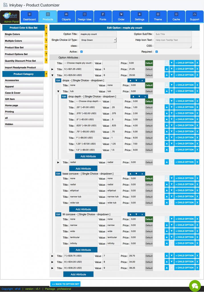 - Add child option (you can add unlimited child option/attribute to any options, it will work as conditional as you added. You can add any other option type as child option.)
